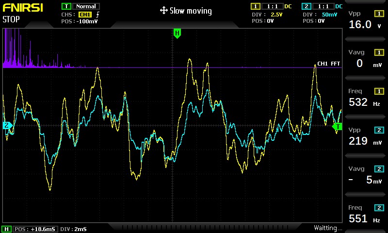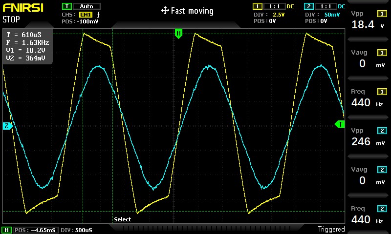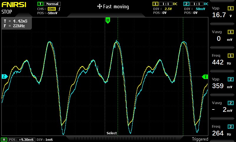 The input signal (blue) and the output signal (yellow) amplified by a factor of 56.