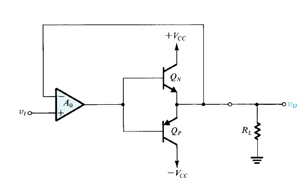 To control the output voltage and maintain stable gain, the op-amp is also connected to the transistor bases, with its output linked back in a negative feedback loop to the op-amp. This ensures consistent performance and precise control over the amplification process.