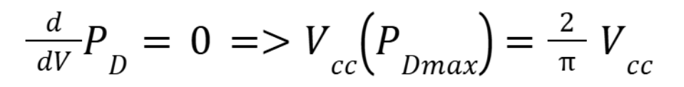 If we are to deal with heat dissipations we want to calculate the maximum power that will dissipate as heat over the body of the transistor. At this point we see that the equation represents a “sad” parabola. So to calculate the max point we shall calculate the derivative with respect to voltage of the previous equation and compare it to zero: